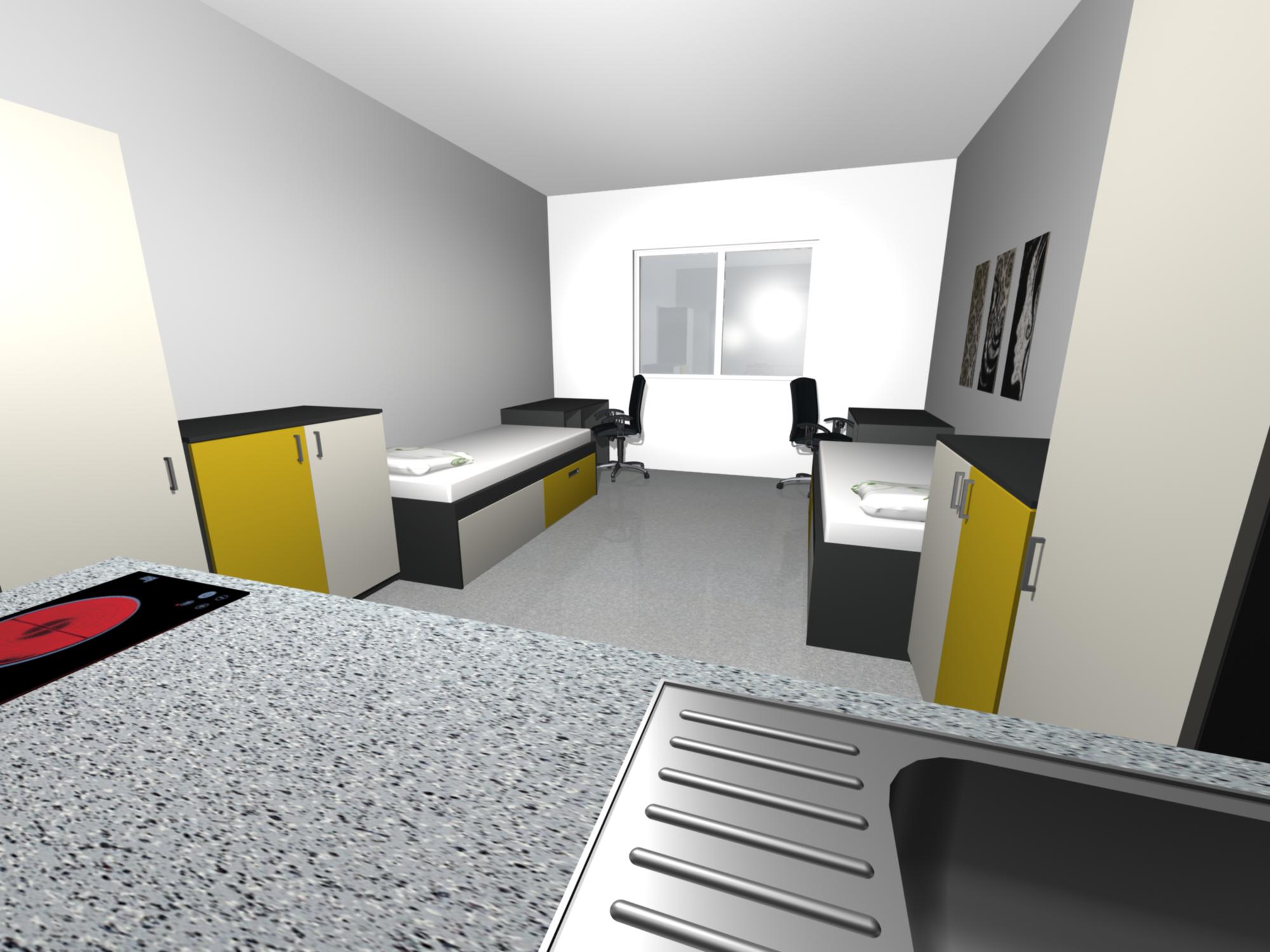 kuchyňská linka vybavená spotřebiči (lednice, mikrovlnná trouba, vestavný indukční dvouvařič, ve větších 2+kk pečící trouba, dřez)